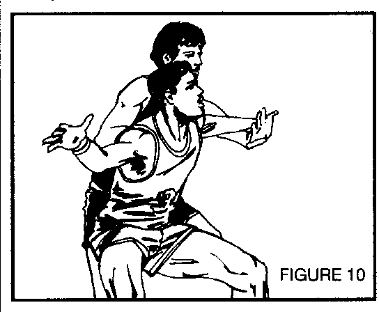M Et aussi le départ croisé après avoir attaqué le pied avant du défenseur qui oblige ce dernier à le reculer (déplacement de la balle vers le genoux opposé en la passant au dessus des épaules avec une protection des coudes ou par le bas). Figure 7.